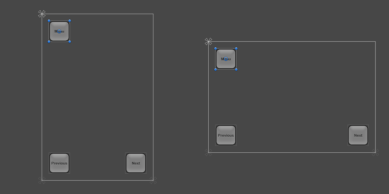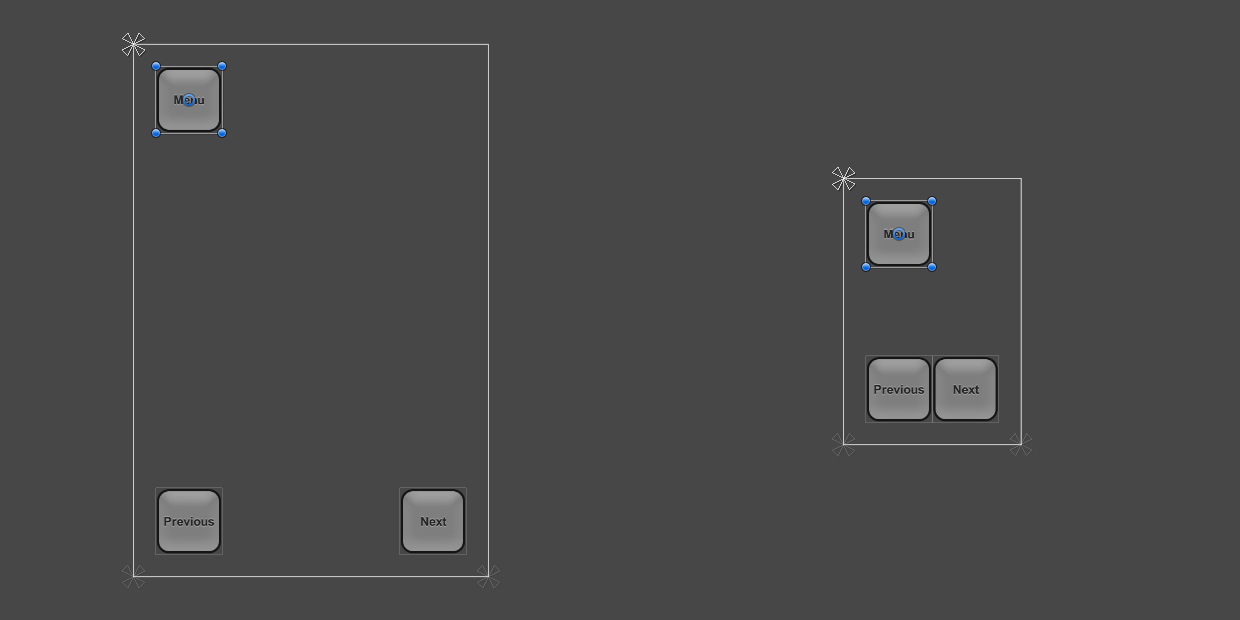 When the screen size is changed to a larger or smaller resolution, the buttons will also remain anchored to their respective corners. However, since they keep their original size as specified in pixels The smallest unit in a computer image. Pixel size depends on your screen resolution. Pixel lighting is calculated at every screen pixel. More info